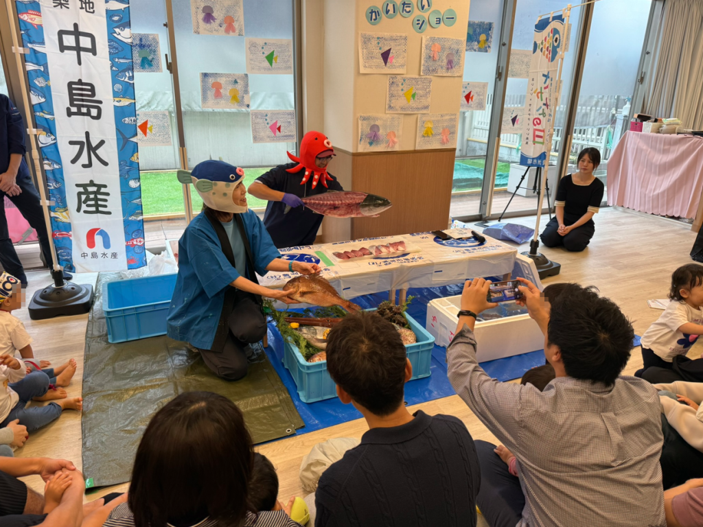 このほかにも保育園の近隣にある小売店舗の紹介やマダイ、マアジ、マダコといった数種類のおさかなの展示と名前を当てるクイズ等を実施。
