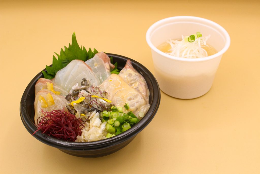 白寿真鯛0(ゼロ)は当社のお取引先である赤坂水産様(愛媛県西予市)が養殖するマダイで、海の豊かさを守るため飼料として魚粉等の水産資源を使用せず、大豆や白ゴマ等の植物由来の餌で育てています。この白寿真鯛の身はもちろん、骨・皮・ウロコも余すことなく使用。刺身(醤油)、柚子がアクセントの漬け、ゴマの利休漬けの三種のネタ、湯引きした皮、揚げたウロコが乗った海鮮丼とあら汁を提供いたしました。