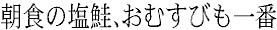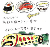 子供の頃を南房総の千倉ですごしたので魚大好き人間に育った。ぼくの身長一七五センチ、体重六三キロはほとんど魚でできているといっていい。ペンネームの「水丸」も、どこかで魚を意識しているといっていい。「魚心あれば水心」である。 魚はほとんどといって食べている。子供の頃の家の前は、太平洋で、とにかくそれはとてつもなく大きな水槽を持っていたようなものだった。 そんなぼくが、あんがい遅くに口にした魚に鮭がある。千倉では、魚は漁師から直接手にしていたので町には魚屋がなかったのが原因だ。フフ、そんなわけではじめて口にした鮭は缶詰だった。好きな人に頬ずりされたようなほんのりした味で、たちまち取り付かれた。 今では朝食で食べる塩鮭がたまらない。焼くと身の表面に塩をじわっと吹いてくる辛口の塩鮭で食べる暖かい御飯はたまらない。おむすびも一番だ。ああ、何だかお腹が空いてきた。 |