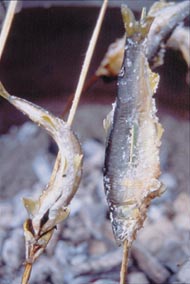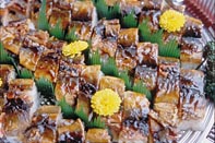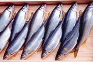 | 和歌山・紀ノ川の鮎 関西空港から車で1時間弱、紀伊半島の西南に位置する和歌山市川辺。この地に、鮎を養殖している酒井水産があります。美しく連なる和泉山脈の麓にあり、山から流れ出てきたわき水と、地下20m〜50mもの深さにある紀ノ川の地下水が合流するという恵まれた環境の中で、鮎たちは大切に、大切に育てられているのです。 養殖場に1歩足を踏み入れると、そこには16個もの縦横10m四方の大きさの生け簀があり、その中には約3万匹の鮎たちが元気よく泳いでいます。生け簀の中には水車が仕込まれており、鮎たちは、勢いよく流れに逆らって泳ぎ回ります。 最も良いとされている鮎の特徴としては、1.エラのうしろの部分が肉厚で追星と呼ばれる波紋が鮮やかなクリーム色に色づいていること、2.下ヒレやお腹のしたにうすい黄色い色味がかかっていること、3.顔つきは面長で唇がしっかりと大きいこと、という要素があげられます。この酒井水産で育った鮎たちのその仕上がり具合は、パーフェクトでまるで天然ものの鮎のようです。 |  |