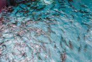 | 清らかな水が鮎の源 ふと、養殖場の裏にある紀ノ川を覗いてみると、そこには天然の大きな鯉が泳いでいます。産卵のためにこの地にやってくるという。改めて、この透き通った水の美しさを再認識します。鱗も肌理がこまかくて、ツルンとしている鮎たちのルーツはなんといっても清らかな水。まさに鮎の命といえるでしょう。鮎の成長のプロセスを追っていくと、和歌山県の貴重な資源の水と、自然と共に生きようとする愛情たっぷりの人の手の温かさに出会います。育て、養い、共に生きる。 今年の夏は、是非、和歌山の鮎を召し上がってみて下さい。鮎の甘い香りに優しい気持ちになれますよ。  |