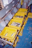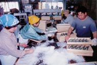 | 餌の量は、魚体重の2.5%の量を与え、主成分の他に植物性である大豆油由来のビタミンEや各種ビタミンを添加し健康的に育成されています。中島水産と飼料会社との共同で開発した斬新でヘルシーな飼料を使用することで、魚を元気にし、栄養バランスも充分整い、鮎たちは美味しくすくすく育つのです。 養殖していくプロセスは、秋に、琵琶湖から天然稚魚を買い付け、大きさごとに選別作業を行います。5月に入ると出荷作業がスタートし、養殖現場は活気づきます。 一番神経を使う仕事は水揚げです。鮎は空気に触れると色が変わってしまうデリケートな魚なので、11℃に生け簀の温度を保ち、すぐに氷水のケースに鮎を移します。これにより、鮎の身が引き締まり、歯ごたえが良い仕上がりとなるのです。その後、再度大きさごとに選別し20×40cm台の木箱に美しく並べ、氷を真っ平らに敷き詰め梱包します。この仕事ひとつひとつが迅速かつ丁寧で、スタッフ達の心意気が伝わってくる程。 |  左右対称にキレイに並べていきます