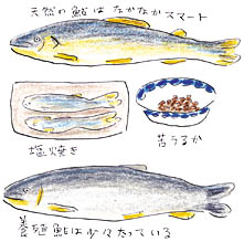 鮎は日本の淡水魚を代表する魚といっていい。この魚の美味はもちろんのこと、その人気は、よく日本画に描かれたり、詩歌にうたわれていることでもわかる。 鮎の寿命はわずか一年であり、そのため「年魚」などとも呼ばれている。俳句では夏の季語である。 水原秋櫻子の句だ。 鮎には、「姿造り」、「背ごし造り」、「塩焼き」、「照り焼き」、「あめだき」など、さまざまな料理法があるが、ぼくが一番好きなのは「塩焼き」だ。骨を抜き、塩を吹いている鮎の頭からちぎるのはたまらない。御飯のおかずというよりは酒の肴としての方が合っている。 ねっとりとしたぬる燗の酒に鮎の塩焼き、これはもう普通ではなく、御馳走である。 鮎料理で忘れてはならないのが、内臓を塩辛にした苦うるかだ。日本人というのはどうしてこんな見事な料理を考えつくのか。鮎をほんとうに好きなのだろう。鮎は芸術だ。 |
