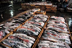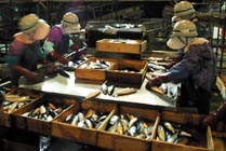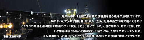 松浦から出港する漁船は主に東シナ海、五島、対馬沖の漁場を目指し、まき網漁法でサバを獲ります。水揚げ量は多いときで1日500tを超えることも!なかでも五島西方・対馬海域で10月から2月までに獲れた400g以上のマサバだけが、松浦のブランド魚、旬(トキ)サバとして高値で取引されます。 サバは脂質が極めて豊富で、EPAやDHAの含有量は青魚の中でも群を抜いて多い魚。血栓症や癌の予防、ぼけ防止などに高い効果を発揮します。今は一年で最も身が締まり脂がのる時期。煮る・焼く・揚げるなど、どんな調理法でもたまらない美味しさです