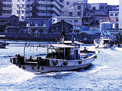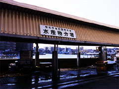 | 午前11時30分にスタートするセリに間に合うように船が到着。 | 漁師さん達の船は、ここに停泊し収穫した魚を水揚げします。 |