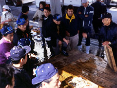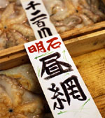 | 大きさごとに選別された魚をセリにかけます。 | 威勢の良いかけ声とは裏腹に、どこか和んだ雰囲気が明石流。 |