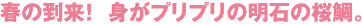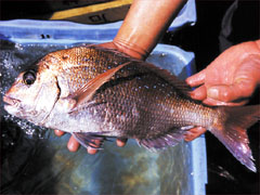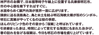 | 毎年4月の10日頃。春の風物詩・いかなご漁が一段落すると、続いて桜鯛の季節が始まります。瀬戸内海に面した明石市の四つの漁港には、太平洋から瀬戸内海へ真鯛の大軍が流れてきます。明石海峡にもまれて育った鯛は身が締まっているうえ、産卵前なので卵がいっぱい。桜の季節に訪れる薄ピンク色の真鯛は響きも心地よい「桜鯛」と呼ばれています。 午前3時には出港し、網をしまうのは午前8時。漁では、長年の経験や魚群探知機を使って獲物を追いつめ仕留めます。餌は、エビや小さな蟹など様々。眼前にそびえる明石海峡大橋の下で釣り上げて昼前には明石の港に到着します。季節の魚による網のつけかえや船の操縦、魚の釣りあげも全て一人で行っているとのこと。迅速な仕事ぶりの明石の漁師さんは人なつっこくとにかく陽気。水産物分場へ水揚げされた鯛は、午前11時半にセリにかけられます。 |