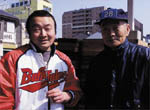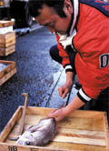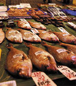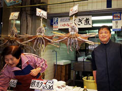 | これが明石産の見事な桜鯛。海から水揚げされたばかりの新鮮な鯛をすばやく絞めます。 | 明石のもう一つの名物といえばやっぱりタコ。竹に伸ばされて干された姿は、まるで凧のよう。 |