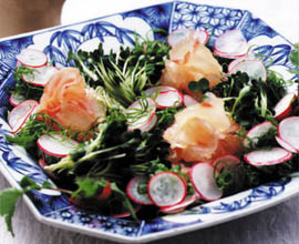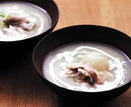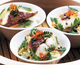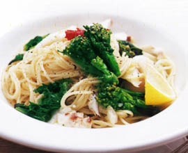 おさかなのお料理は何と言っても鮮度が大切ですね。ごまかしようが無いですから。今回の明石の鯛は、身がプリプリに締まっていてとても美味しい素材でした。お刺身で食べても充分美味しいのですが「昆布〆」の様に、一晩昆布で〆るとさらに身がしまり昆布の旨味が鯛に加わってより美味しく頂けます。あまった昆布は、細かく刻んで佃煮に。鯛は、余すことなく生かし切れる素材です。「クリーミィースープ」の味の決め手は水から煮た鯛のあら。玉ネギではなくネギを一緒に煮てミキサーでとろみをつけるだけですが、あらからでたコクと旨味が強くとても美味しい一品です。あら汁でご飯を炊いて、焼いた鯛をほぐしてジャーに加えれば鯛飯にもなりますし、この出汁で作った「鯛のタイ風カレー」も美味しいですよ。春らしく「パスタ」では菜の花を使いました。鯛は淡泊なおさかななので、菜の花の苦みと良くあいます。パスタソースには、身ではなく中落ちの部分をこそげて使えば経済的ですし、お味も良いです。ポイントは、下ごしらえの時鯛に多めに塩をふり水気を取ること。身も締まってより美味しくなります。仕上げの塩加減はお好みで調整して下さい。