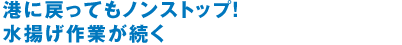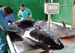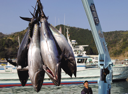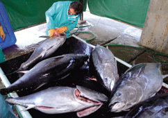 | 捕獲されたまぐろは束ねられてクレーンで水揚げされます。つねに身が焼けないよう海水氷を使い、気を配ります。陸に揚げられた後も、さらに丁寧に血合いを取り除き、洗浄。1体1体計量して、名札をつけたら、再び海水氷の中に入れ込み、1箱に約10匹を収容して完成。コンテナごと陸送で、東京・大田市場に届けられます。 |