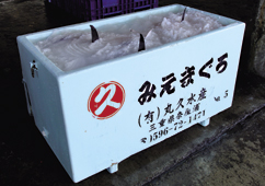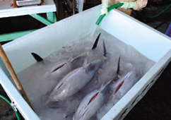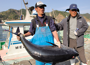 | 「取れたては身が柔らかいから持ちにくいんだよ」と今日釣り上げたばかりのまぐろを抱えてくれた漁師さん。天然に比べると小ぶりですが、味は保証すると丸久水産の会長さん。おいしいまぐろを私たちに届けるため、日々努力してくれている方々です。 | |