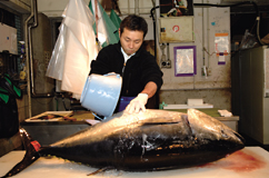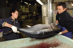 こうして、釣り上げられたまぐろは、大田市場に到着したその日に店頭に出され、私たちの食卓に並びます。 1年中まぐろを食せることが、あまりにも当たり前のようになっている昨今、私たちのためにこれだけの手間をかけておいしいまぐろを届けてくれる人々がいるということ。また、私たち好みのまぐろを提供するために、良質の赤身と脂の絶妙なバランスを考え、育ててくれていることに感謝して、今日もおいしいまぐろを堪能しましょう。 |