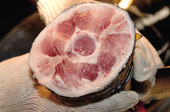 まずは尾から。ここが旨さのバロメータ。 見よ、この脂のりのよさを。 |
