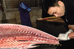 まぐろの3枚おろしは、力とコツが必要。 巨体だけに1枚が巨大。 |