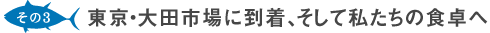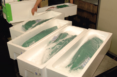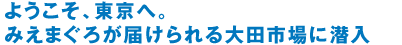 | 前日に釣り上げられたまぐろ20匹が、翌朝無事に東京・大田市場に到着。大田市場は国内最大級の青果および花市場として知名度の高いところですが、立派な水産物部も構えています。この水産物部にみえまぐろはコンテナごと到着し、解体され、中島水産の各店へ送られて行きます。 |