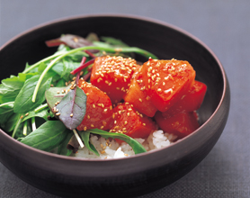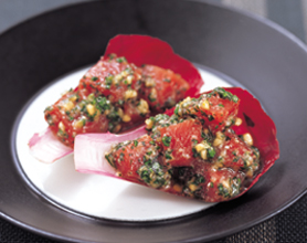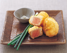 今回のお料理の中では、まぐろのフリッターに関してのポイントを。卵白の泡立ては角が立つくらいしっかりめに。油に入れる際にスプーンですくい、十分からめるようにつければ、プクッと愛嬌のあるかわいらしい形になりますよ。今回は山椒と塩で和風に仕上げましたが、粗挽き胡椒やチリペッパーなどの調味料に変えると、白ワインが合う洋風テイストになります。ワイン好きな方にはぜひ挑戦してほしいですね。一般的にまぐろは味がつきにくいので、味見をしながら少しずつ調味料を足していってください。調味料次第でエスニック風にもなりますし、レシピは無限大です。