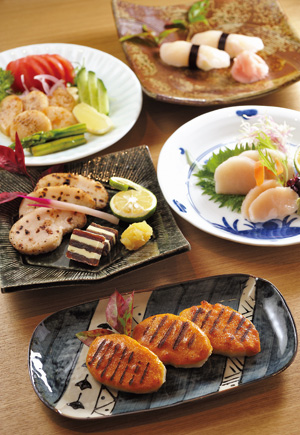 手前から時計回りに、貝柱のウニ焼き、貝柱の塩焼き、貝柱のバター焼き、貝柱の握り、貝柱のお造り。いずれも時価。たいらぎメニューは漁が行われている間は食べられますが、入荷が不定期なので希望の場合は必ず事前に連絡を。 |