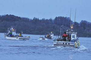 朝の4時、一斉に漁がスタートします。時間もしっかり厳守。フライングをする人はひとりもいません。漁場は潮の流れや天候など、状況に応じて移動するそうですが、だいたい水深1.2〜3メートルのところで作業します。周囲約44キロの網走湖、資源は豊富です。