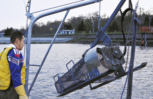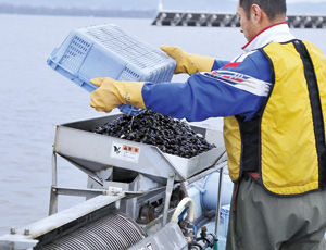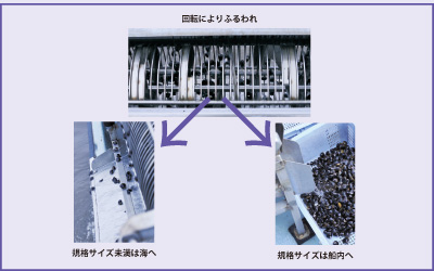 まず、「じょれん」と言われる土砂をかき寄せ貝などを獲るための道具を海に落とし、湖底でしばらく流します。ある程度経つと揚げられるわけですが、じょれんの上部にファンモーターがついていて、それによって余分な砂などは落とされます。
