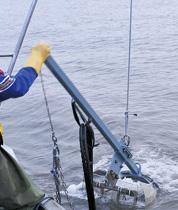 網走湖産しじみの特徴は粒が大きいことですが、規定で14ミリ幅の「トーシ」とよばれるふるいに残った厚さ15ミリ以上(殻長約23ミリ)のものしか獲らないことになっています。この規格を通るものはだいたい7〜8年もの。船に専用の選別機が搭載されており、規格未満のサイズは海に戻される仕組みになっています。さらにトーシで、海水につけながら選別。中身が空だと水面に浮き、小サイズだと自動的に海に落ちて行きます。