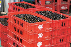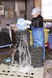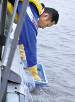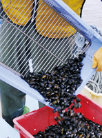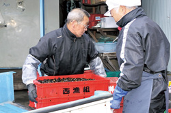 選ばれたしじみは指定のコンテナに詰め替えられます。1コンテナも重量が定められており、100キロに達して終了。自宅に持ち帰って、再度選別して、仲買人へ届けます。 |