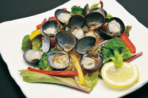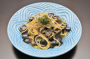 しじみのパスタ フライパンにオリーブオイル、にんにくのみじん切り、赤唐辛子を入れてしじみを炒める。口が開いてきたら茹で立てのパスタを入れて濃口醤油とみりんで味を整え盛りつける。天盛りにきざみ大葉、みょうがの子、いりごまを振る。 |