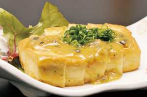 豆腐和風ステーキ しじみ味噌がけ 豆腐は水気を切り、小麦粉をまぶし、サラダ油をひいたよく熱せられたフライパンでしっかり焼く。両面に焼き目がついたら日本酒でフランベ。みりん、薄口醤油で味つけし食べやすい大きさに切って器に盛る。しじみ味噌は、しじみをフライパンで焼き、口が開いてきたら日本酒を適量入れて殻から身を取り、汁と分けておく。田舎味噌に砂糖と先の煮汁、みりん、卵黄を合わせて練り込み、最後にきざみ大葉、いりごま、おろし生姜を合わせ、最後にしじみの身を加える。 |