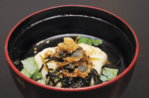 焼きむすび茶漬け しじみ時雨煮 しじみのむき身を針しょうがとともに鍋に入れ、日本酒、砂糖、濃口醤油、みりん、たまり醤油で甘辛く時雨煮に。小さめのおにぎりを焼き、器に盛り、熱々のだしを注ぎ、三つ葉、きざみ海苔、いりごま、しじみ時雨煮、おろした山わさびを添える。 |