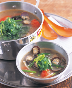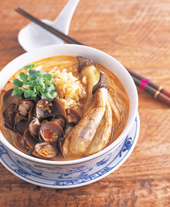 旦那さまのダイビングに付き合い訪れたタイで食べた料理に心奪われ、東南アジア料理を得意とする料理家となった村松さん。しじみを題材に身近で手に入る食材を使って多国籍レシピを提案してくれました。「むき身にするのは大変な作業だけど身までしっかり食べてもらうためにはむき身料理が一番と思って、ごはん、つくね、だし巻きを考えました。またしじみの旨味やだしを活かすには汁物系がいいと思います。」泡盛を使った酒蒸しは香りが豊かで汁ごといただきたく、スープはやさしく夏バテに効きそう。つくねはレッドカレーペーストがアクセントになっていて食が進みます。