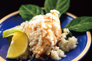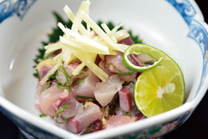 1.「なおしまハマチのかわり造り、ハリしょうが添え」 しその葉とおろししょうがを混ぜたものをわさび醤油で。さっぱり食べたい人に。 |