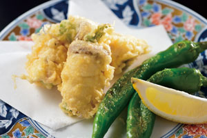 3.「直島ハマチのグリーンアスパラ巻き揚げ」 塩とレモンで。甘みをより感じます。 |