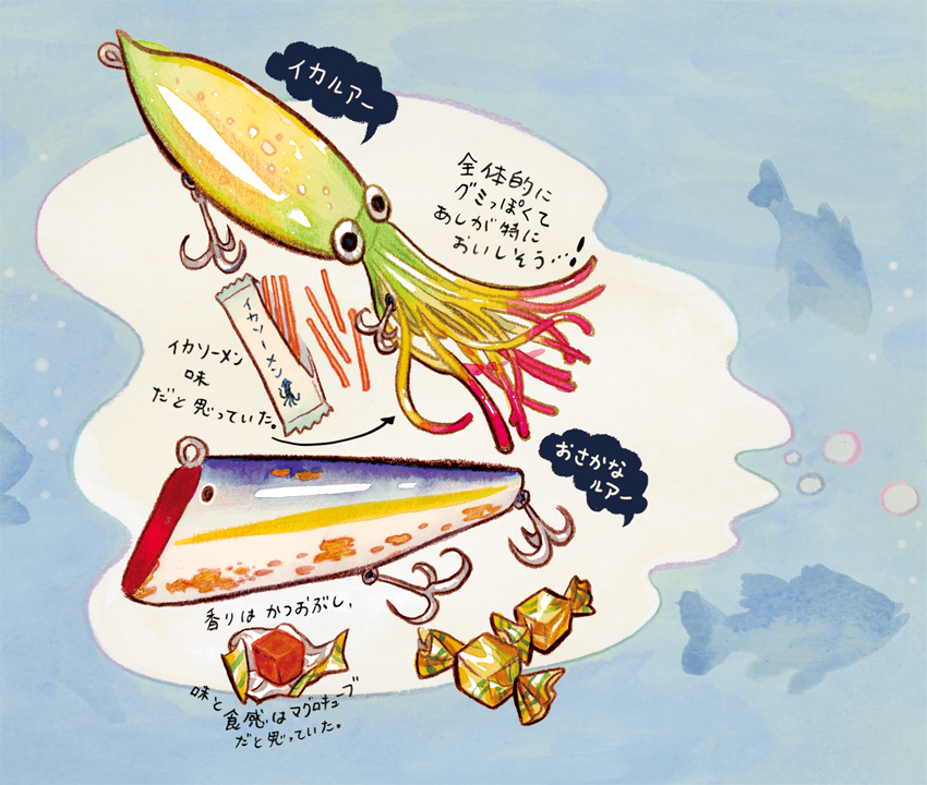 私が何より好きだったのはイカの形をしたゴム製のルアー。うすい黄色の蛍光色のゴムでできていて、長い頭の下に黒と銀に光るビーズのような目、その下からは何本もの細くて長い脚がシャワーみたいに伸びているものです。少し透けた蛍光色とラメが入ってるゴムは、どことなくグミを連想させていかにもおいしそうだし、細長い足は私の大好物であるするめ、イカソーメンのような噛み心地がするだろうと思っていました。一本口に含んでその細さをじっくり噛みしめてみたり、何本も一纏めの束にして口に入れごむごむと噛み切りたい気持ちがぐつぐつと湧き上がります。危険な針がついた絶対食べられないルアーは、私の中ではもうイカソーメン味の魅惑の物体なのです。