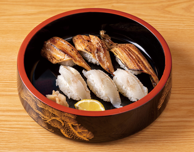 | にぎり寿司(時価・要予約)はナマと炙り・タレ付の2種。柑橘との相性も良。 |