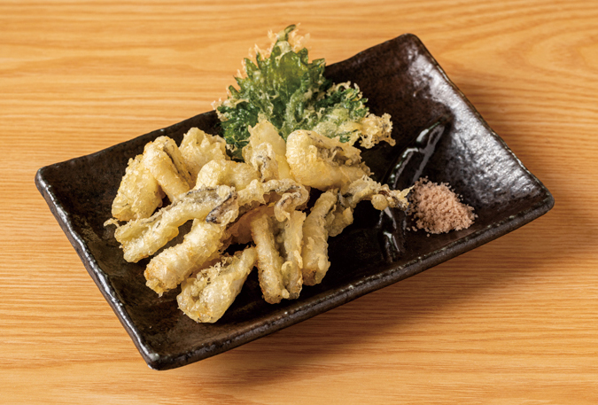 天ぷら(¥700)は土地の藻塩で。 ※「穴子のフルコース」は1人前¥3,300(税込)で刺身、しゃぶしゃぶ(〆の雑炊)、白焼き、煮穴子、天ぷら、にぎり、骨煎餅 ※すべて税込 |