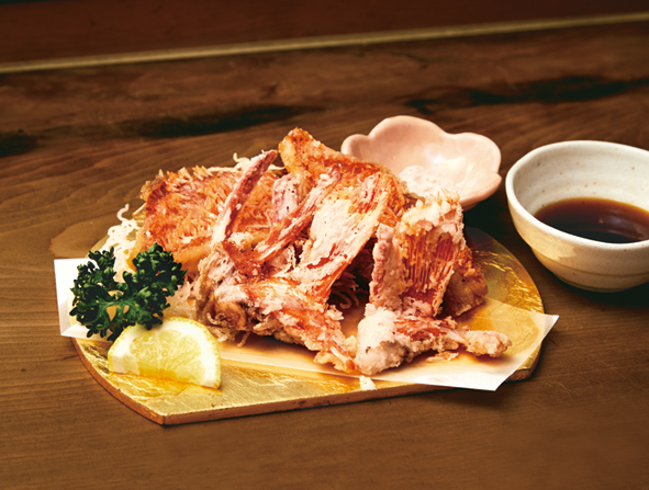 | 唐揚げ(¥3,000)は身の方にだけ片栗粉をつける。 ウロコは油でたたせてサクサクした食感に |