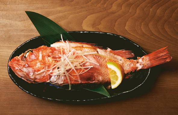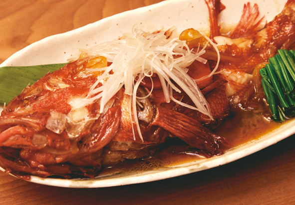 | 煮付け(¥6,000)は水を使わず酒、醤油、みりんだけ。生姜、ニンニク、タマネギが隠し味に |