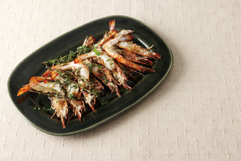 1. フライパンにハーブと油を入れ、弱火にかける。油にハーブの香りが移ったら火を止め、粗熱を取る。 2.えびは殻つきのまま頭ごと縦に半分に切る。頭側、胴側と2回に分けて包丁を入れると切りやすい。 切りにくい場合は殻のみ、はさみで切った後、身を包丁で切るときれいに切れる。 3. 1.のフライパンに殻を下にしてえびを並べる。強めの中火にし、油がグツグツと音を立て始めたら蓋をし、身の表面が軽く白っぽくなるまで10〜15秒ほど温める程度に加熱し、蓋を取って火を止める。 4. 器に、ハーブとともにえびを殻が下になるように移す。フライパンに残ったオイルに塩を少々入れ、再度火にかける。温まったらレモン汁を加え、手早くえびにかけ、パセリを散らす。 |