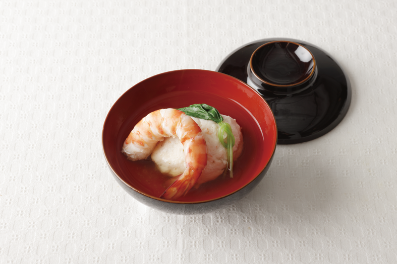 1. えびしんじょをつくる。えび3尾の頭と尾を取り、殻をむく。さっと水洗いをし、水けをペーパーで拭く。えびの背から包丁を入れ、2枚に切って背わたを取り、包丁で細かく刻む。 2. ボウルに1.のえび、たらのすり身、だし、塩ごく少々を加え、ゴムべらでよく混ぜる。卵白を入れ、均一に混ざったら、大和芋を加えてさらに混ぜる。 3. 鍋に湯を沸かす。2.を2等分にし、手に水をつけて丸く形作り、湯にそっと入れる。弱火で5分ほど加熱し、火を通す。 4. 鍋に吸い地用のだしを入れて温め、しょうゆ、塩で味を調える。残りのえび2尾を入れてさっと火を通す。えびを取り出し、頭を取って胴の殻をむく。 5. 椀にえびしんじょ、4.のエビを入れ、三つ葉をのせ、温めた4.の汁をはる。 |