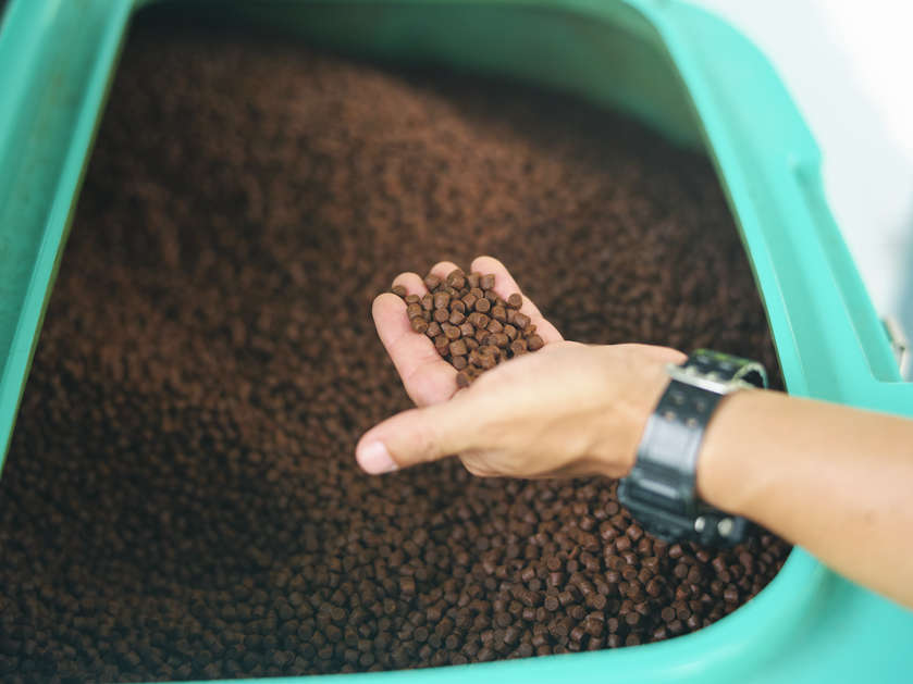 独自のレシピでブレンドされた餌。主に自動給餌機により1日に数十回散布する