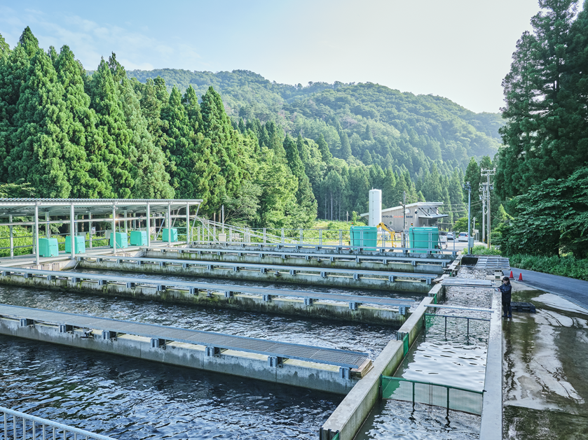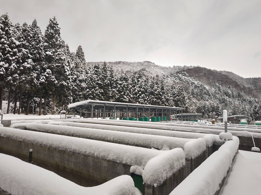そんな大野市の中心部から山の方へ車を進めること30分弱。杉木立の森を抜けた山間に拡がる「宝慶寺サーモンベース」で、「越前名水サーモン」は育てられています。ここは九頭竜川の支流・清滝川上流の水と湧水が注ぐ陸上かけ流し式の淡水養殖場で、生簀(いけす)は常に清らかな水で満たされています。水温は真冬は2℃程度、真夏でも20℃を上回らず、水量や水中の酸素量などのコントロールがきめ細かく行われ、魚にとって最良の環境が維持されています。
