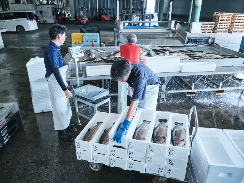 福井中央卸売市場に運ばれたサーモンは台の上で大きさを選別され、計りにかけられていく